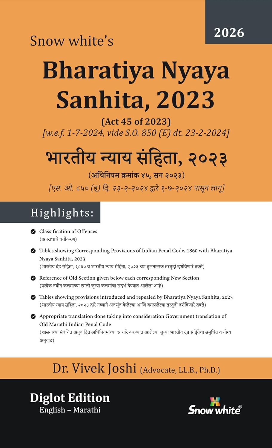 Snow White’s Bharatiya Nyaya Sanhita, 2023 | भारतीय न्याय संहिता २०२३ (BNS Diglot English – Marathi)